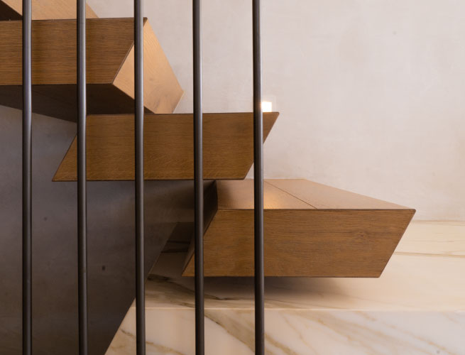 The staircase was a custom designed as a parallelogram floating tread which created a uniquely exclusive