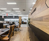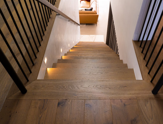 The staircase was a custom designed as a parallelogram floating tread which created a uniquely exclusive